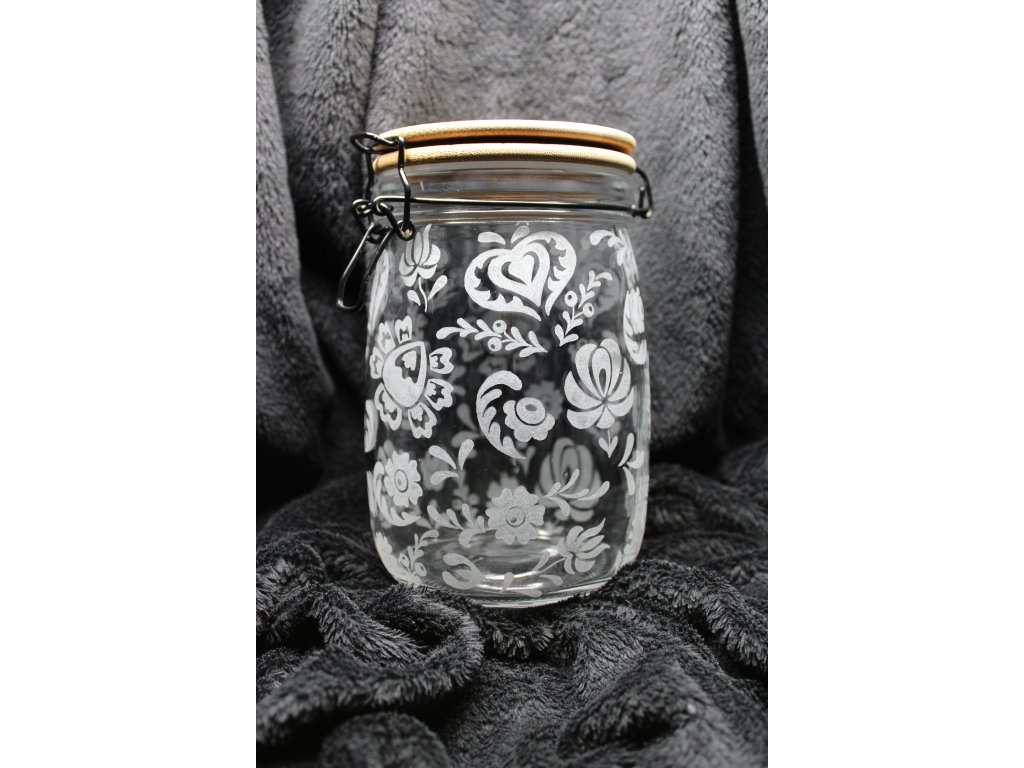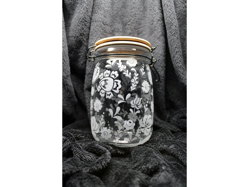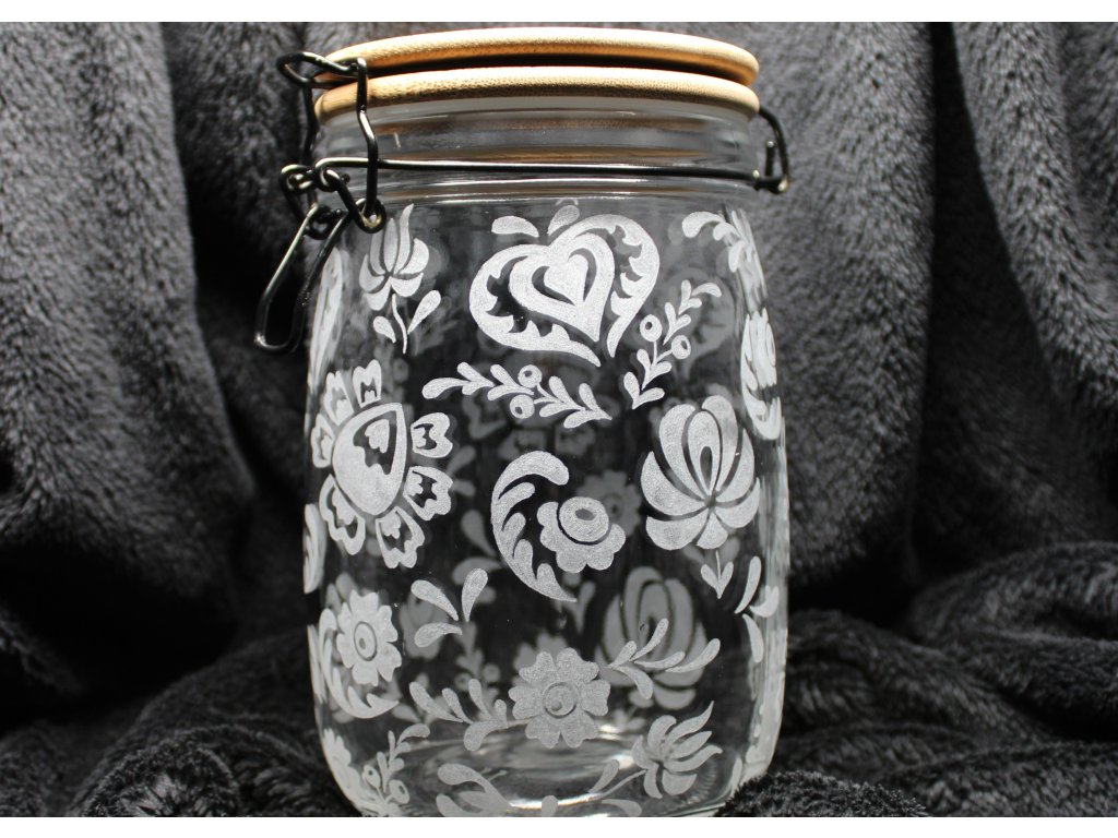 Ručně gravírovaná dóza 1l, skleněná, kulatá s bambusovým víkem a klip uzávěrem, včetně těsnící gumy (rozměry 17 × 10cm), ideální na uskladnění potravin před vlhkostí.