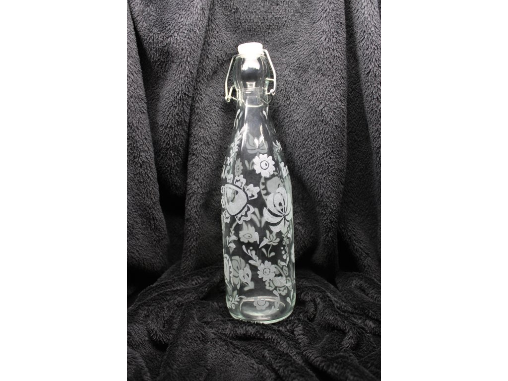 Ručně gravírovaná láhev 0,5l, ideální na limonádu, čaj či sirup, uzávěr je oddělený gumou a kompletně těsní, tekutina se nevylije a uzávěr jemným tlakem nepovolí.