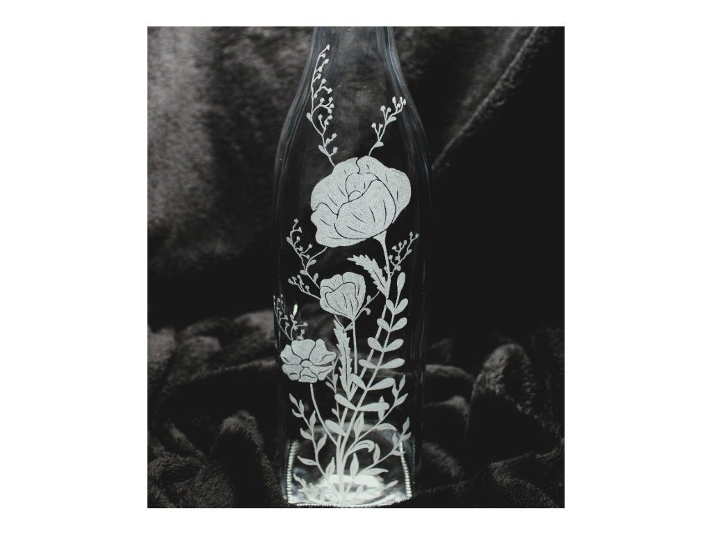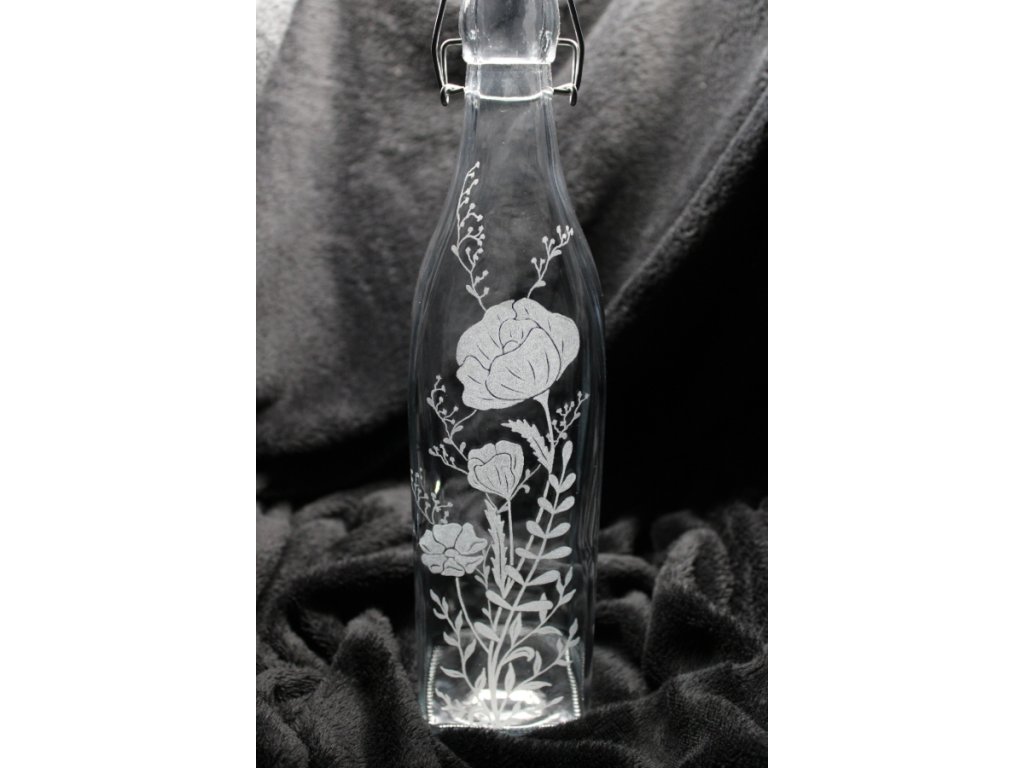 Ručně gravírovaná láhev 1l, ideální na limonádu, čaj či sirup, uzávěr je oddělený gumou a kompletně těsní, tekutina se nevylije a uzávěr jemným tlakem nepovolí.