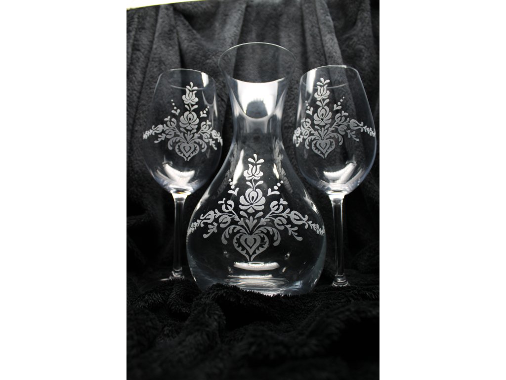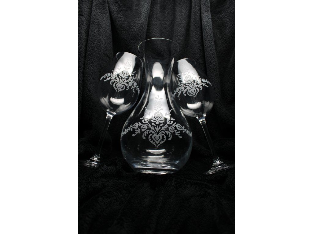 Ručně gravírovaný set: dvě sklenice na víno 350ml Bohemia cristal, s karafou 1,25l Crystalex.