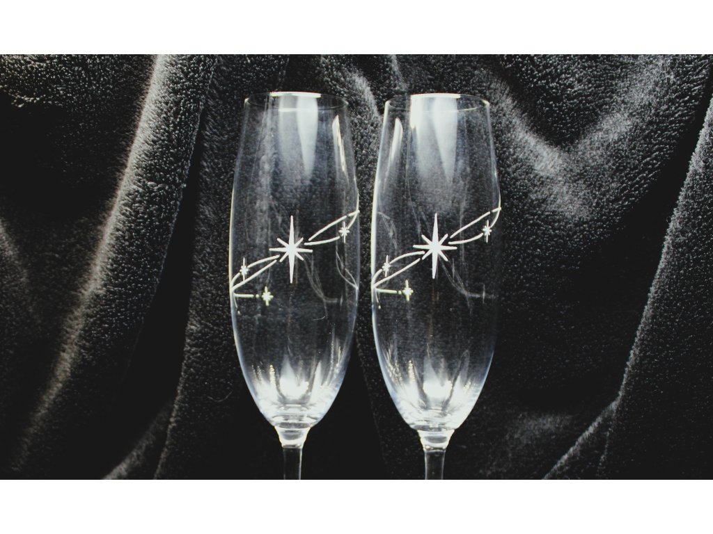 Gravírování na přední straně sklenice, jemně protáhlé do stran.