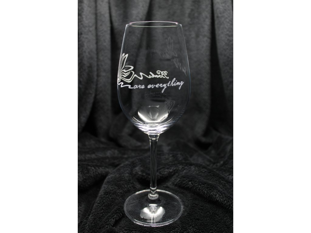 Gravírování na přední straně sklenice, volně zabíhající do stran.
