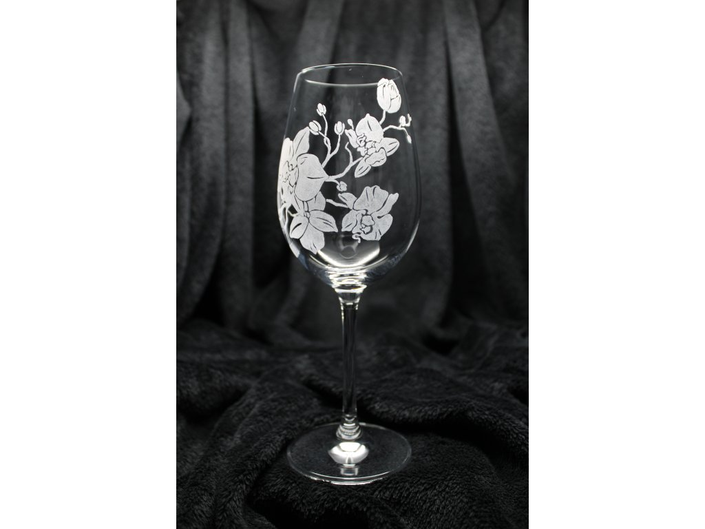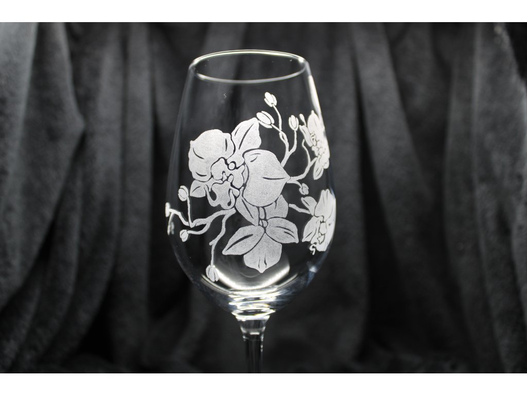 Gravírování na přední straně sklenice jemně zasahující do strany.