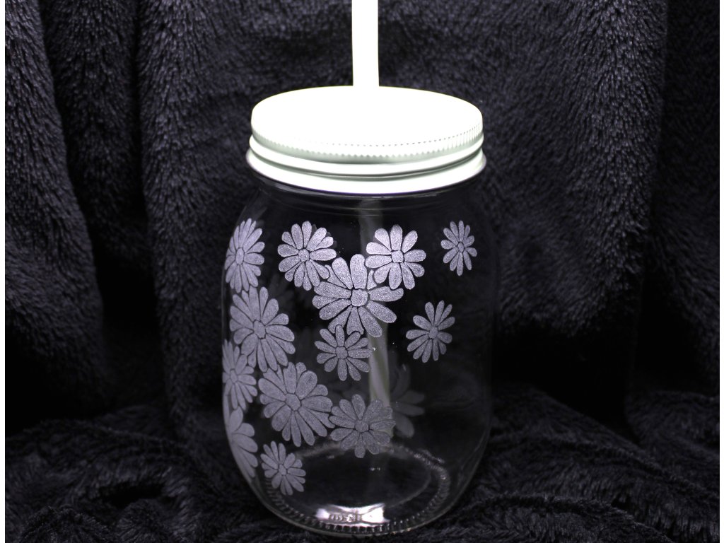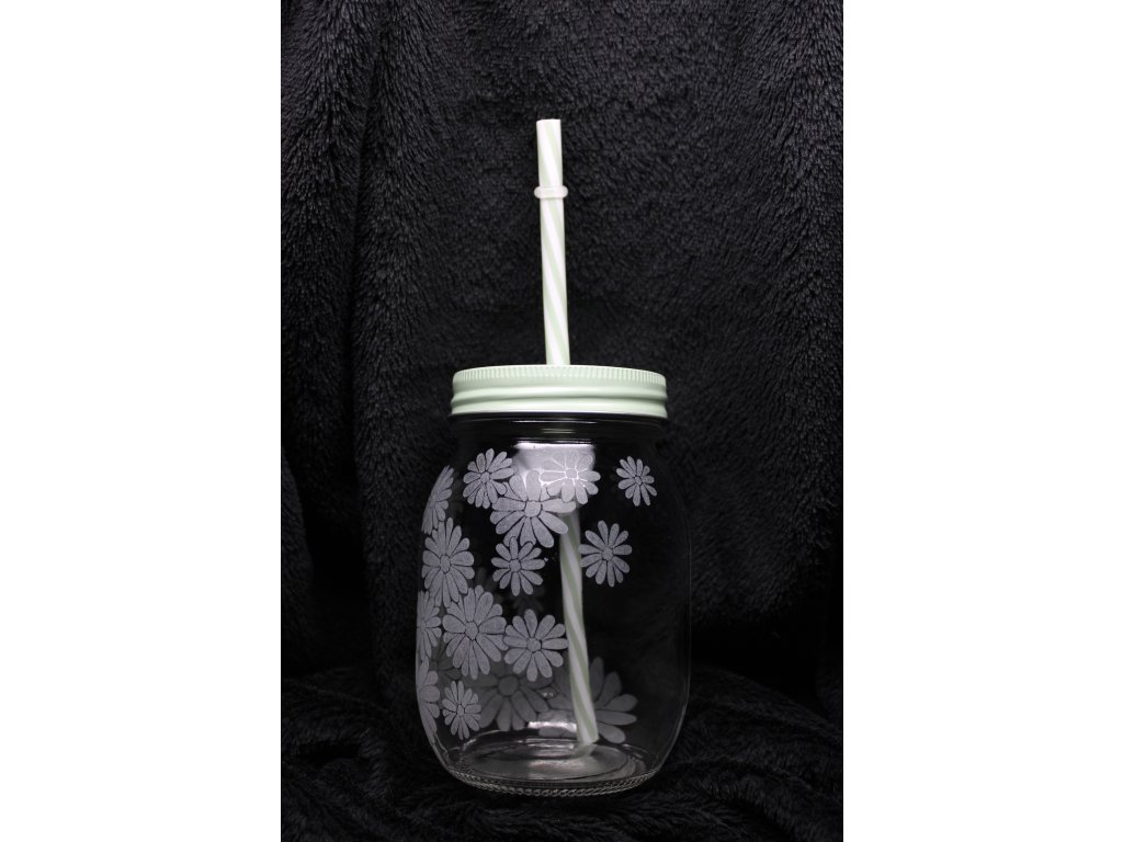 Ručně gravírovaná sklenice na limonádu s šroubovacím víčkem a plastovým brčkem 460ml.